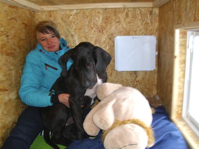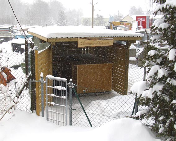 Herrmann ist nun im neuen Zuhause in Wilsdruff eingetroffen. Er hat natürlich, neugierig wie er ist, seine Umgebung gründlich untersucht und ist auf Entdeckungsreise gegangen. Wir haben schon etliche, tolle, aufwändig gearbeitete Schutzhütten gesehen, aber eine mit Fenster und Heizung...!!! Ganz toll, er hat Sonne in der Hütte und kann die Umgebung beobachten. Alle Bedenken, dass er nicht frißt, seine Hütte nicht akzeptiert und gar die Nacht weint und heraus möchte - waren unbegründet. Wir sind glücklich, dass Familie Wolf keine Umstellungsprobleme hat und hoffen, dass sich Herrmann zu einem ausgeglichenen, gut führigen Rüden entwickelt.