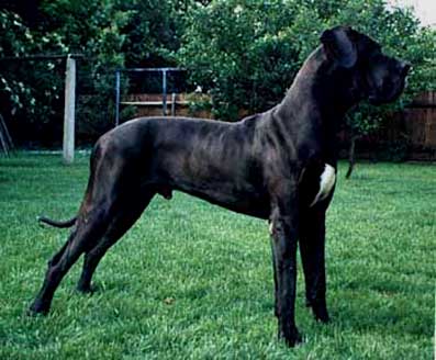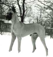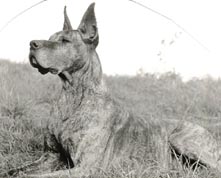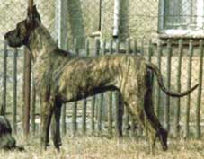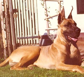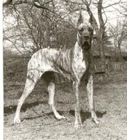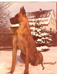 Bess war unsere 1. Zuchthündin - vorher, von 1964 bis 1976, lebte unsere erste Dogge bei uns - der gefleckte "Blitz v. Wesenitz" - und wir suchten damals 2 Jahre lang nach einer Hündin, die unseren Vorstellungen und Anforderungen entsprach. Dieses lange Auswählen hatte sich gelohnt - Bess war eine tolle Hündin, die in allen Teilen dem Rassestandard entsprach und uns den besten Einstieg in das Zuchtgeschehen als "Neuzüchter" bescherte. Sie brachte es zu großen Ausstellungserfolgen: 12 x SG 1 in der Jugendklasse, 2 x V 1 in der Jugendklasse (V 1 in der Jugend wurde nur selten vergeben und nur dann, wenn diese Dogge ein hervorragender Vertreter seiner Rasse war), 15 x V 1 in der Offenen Klasse und 3 x V 2, mehrmals "Beste Hündin". Sie brachte in drei Würfen 26 Nachkommen. Bekannteste Nachkommen waren "Asur, Bac, Basko, Elsa, Endro, Eila und Ellex", von denen hier einige zu sehen sind. Durch übergroße Vorsicht brachten wir nach ihrem 2. Wurf eine Rotlichtlampe an. Da es Winterzeit war, bekam sie durch den häufigen Haus-Hof-Wechsel, verbunden mit starken Temperaturschwankungen, eine Erkältung mit anschließender Lungenentzündung, die in einer hochgradigen Herzmuskelentzündung endete, was ihren Tod mit 5 Jahren nach sich zog.