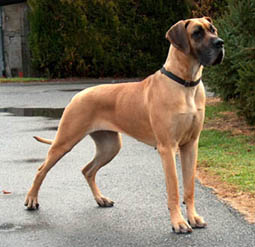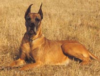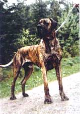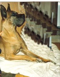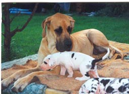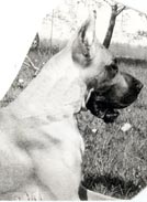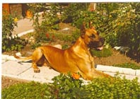 Bei ihrer Geburt, sie wog nur 480 g, konnten wir nicht ahnen, dass Maxi wahrlich eine "Maxi-Hündin" wurde. Sie war mit 88 cm die größte Hündin, die wir je hatten und wog 75 kg. Dabei war sie muskulös und eine beeindruckende Doggenerscheinung. Da sie so lieb und verschmust war, sagte man uns voraus, dass sie wohl kaum die Anforderungen der Zuchtzulassung in punkto Wesen - also auch Abwehr eines Angriffes durch einen Scheintäter auf den Hundeführer - erfüllen würde. Ich vergesse nie, dass Maxi auf dieser ZZL die einzige Dogge überhaupt war, die vom fachmännischen Publikum mit Beifall bedacht wurde. Maxi hatte alles, was man sich von einer Dogge wünscht, nicht nur das Aussehen, die Ausstrahlung, sondern auch den Charakter. Sie brachte mit 4 Würfen 32 Welpen zur Welt- hier sehen Sie "Dex", Debby und weiterhin Maxi mit einem ihrer Söhne. Maxi war die letzte gelbe Zuchthündin aus unserer Linie. Da ihre Tochter Debby, welche wir uns für die Zucht behielten, im Alter von 12 Monaten mit einem Schneidezahn vorbiss, haben wir sie in Liebhaberhand verkauft und damit endete in gelb/gestromt die Vogtlandecklinie! Maxi wurde 9 1/2 Jahre alt.