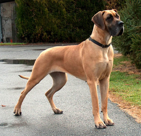 Beurteilung: "Mein" Typ Dogge! Ich liebe sie von der Nase bis zum Schwanz! Hervorragender Kopf, perfektes Gebiss, super straffer Nacken, korrekte, vollkommen gerade Schultern. Für eine Hündin hat sie einen perfekten Stirnabsatz, ausgezeichnete Brusttiefe, sehr gut gewinkelt. Ich liebe die Art und Weise, wie sie mit dem Schwanz wedelt und sich ausdrückt, ihre Haltung, welch Ungezwungenheit, Leichtigkeit in jeder ihrer Bewegung und im Profil ist sie schlichtweg fabelhaft.