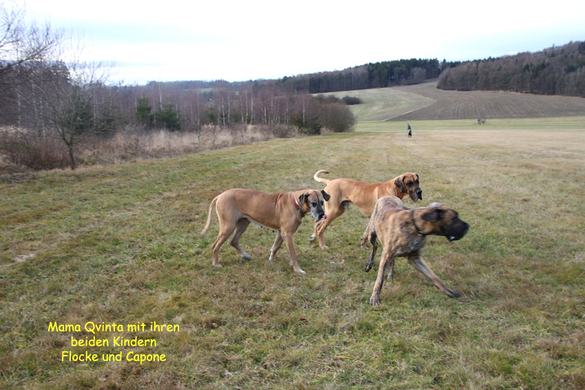 Frieda, Aron, Qvincy mit Biene beim Gassi-gehen